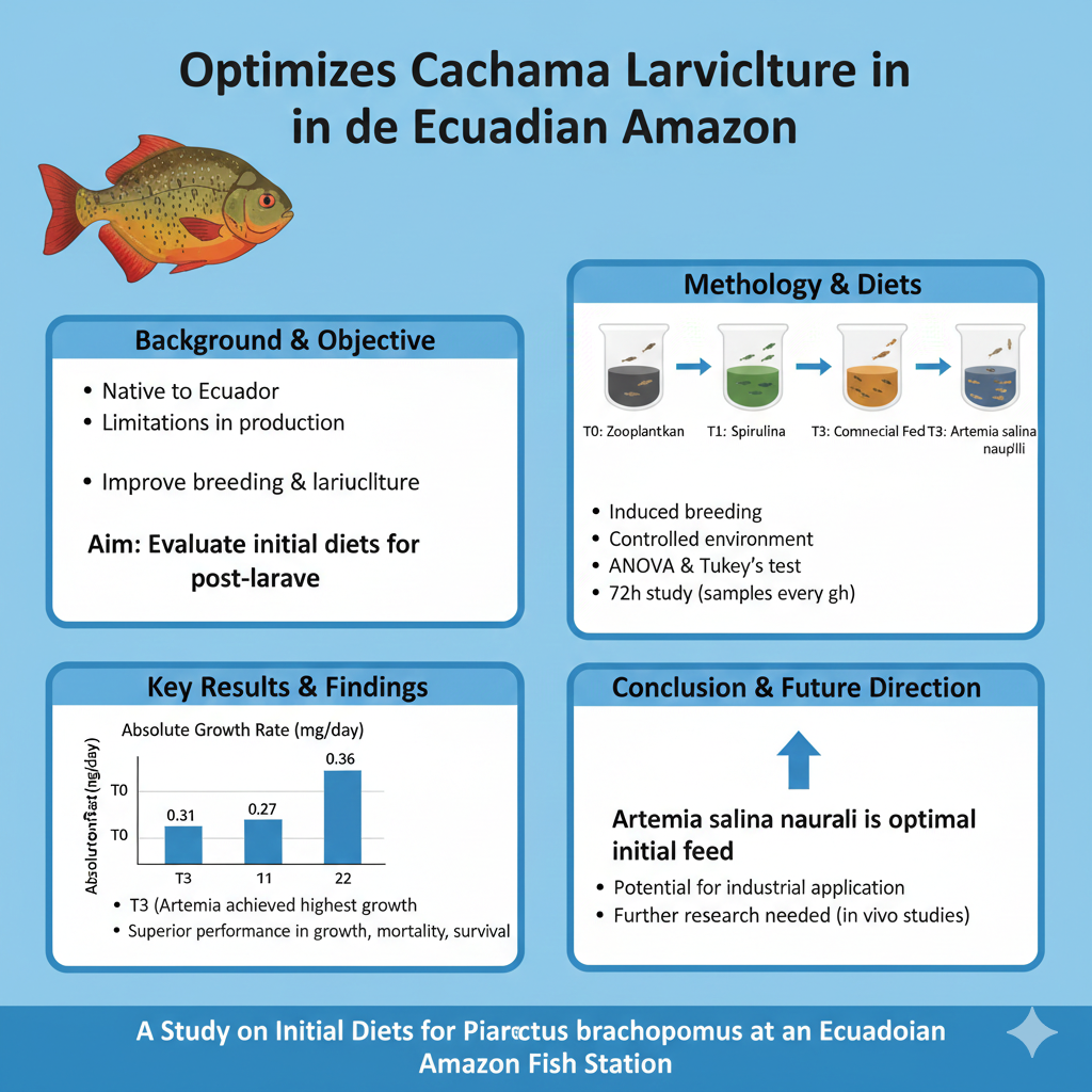 Encuentra más información en nuestro repositorio digital El cachama o pacu (Piaractus brachypomus), especie originaria del Ecuador, ha enfrentado limitaciones en su producción. En este contexto, la atención se centra en mejorar los métodos de cría y aumentar la supervivencia durante la larvicultura. Esta investigación tuvo como objetivo evaluar y comparar el efecto de las dietas iniciales sobre la cría de cachamas post-larvas en ambientes controlados en una estación de peces en la Amazonia ecuatoriana. Las poslarvas de cachama, obtenidas por crianza inducida con extracto pituitario de carpa, fueron alimentadas con dietas específicas para satisfacer los requisitos nutricionales mínimos, asegurando la supervivencia y el crecimiento. Las dietas evaluadas fueron: T0-zooplancton, T1-espirulina, T2-alimento comercial y T3-nauplios de Artemia salina. Se aplicaron análisis estadísticos, ANOVA y la prueba de Tukey para identificar y comparar las diferencias entre los tratamientos. Las dietas evaluadas fueron: T0-zooplancton, T1-espirulina, T2-alimento comercial y T3-artemia salina nauplii. Se aplicaron análisis estadísticos, ANOVA y el test de Tukey para identificar y comparar las diferencias entre los tratamientos. . Los mejores resultados se obtuvieron utilizando A. salina nauplii como alimento inicial. Esta dieta, junto con el zooplancton, demostró un rendimiento superior en los indicadores de crecimiento, mortalidad y supervivencia, promoviendo el desarrollo de las post-larvas. Accede al artículo completo aquí