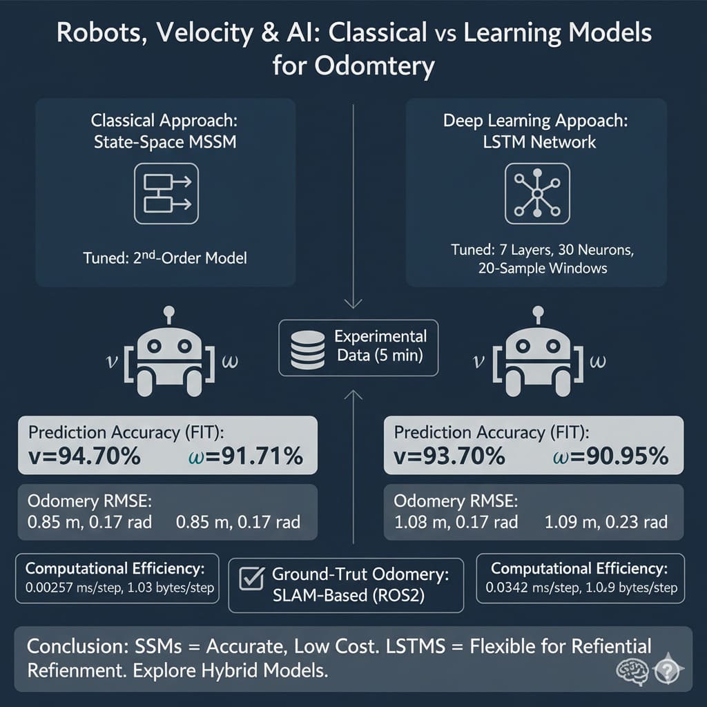 Encuentra más información en nuestro repositorio digital El modelado de robots móviles es crucial para la estimación de odometría, el diseño de control y la navegación. Los modelos clásicos de espacio de estados (SSM) se han utilizado tradicionalmente para la identificación de sistemas, mientras que los avances recientes en aprendizaje profundo, como las redes de memoria a largo plazo (LSTM), capturan dependencias no lineales complejas. Sin embargo, existen pocas comparaciones directas entre estos paradigmas. Este artículo compara dos enfoques de modelado multivariante para un robot de accionamiento diferencial: un SSM clásico y una red neuronal recurrente basada en LSTM. Ambos modelos predicen las velocidades lineal (v) y angular (ω) del robot utilizando datos experimentales de una secuencia de navegación de cinco minutos. El rendimiento se evalúa en términos de precisión de predicción, estimación de odometría y eficiencia computacional, con odometría de verdad fundamental obtenida a través de un método basado en SLAM en ROS2. Cada modelo se ajustó para una comparación justa: selección de orden para el SSM y búsqueda de hiperparámetros para el LSTM. Los resultados muestran que el mejor SSM es un modelo de segundo orden, mientras que el LSTM utilizó siete capas, 30 neuronas y ventanas deslizantes de 20 muestras. El LSTM logró un FIT del 93,10 % para v y del 90,95 % para ω, con un RMSE de odometría de 1,09 m y 0,23 rad, mientras que el SSM lo superó con valores de FIT del 94,70 % y el 91,71 % y un RMSE inferior (0,85 m, 0,17 rad). El SSM también fue más eficiente en el uso de recursos (0,00257 ms y 1,03 bytes por paso) en comparación con el LSTM (0,0342 ms y 20,49 bytes). Los resultados sugieren que los SSM siguen siendo una opción sólida para una odometría precisa con baja demanda computacional, a la vez que fomentan la exploración de modelos híbridos para mejorar la robustez en entornos complejos. Al mismo tiempo, los modelos LSTM demostraron flexibilidad mediante el ajuste de hiperparámetros, lo que destaca su potencial para mejorar aún más la precisión con configuraciones refinadas. Accede al artículo completo aquí