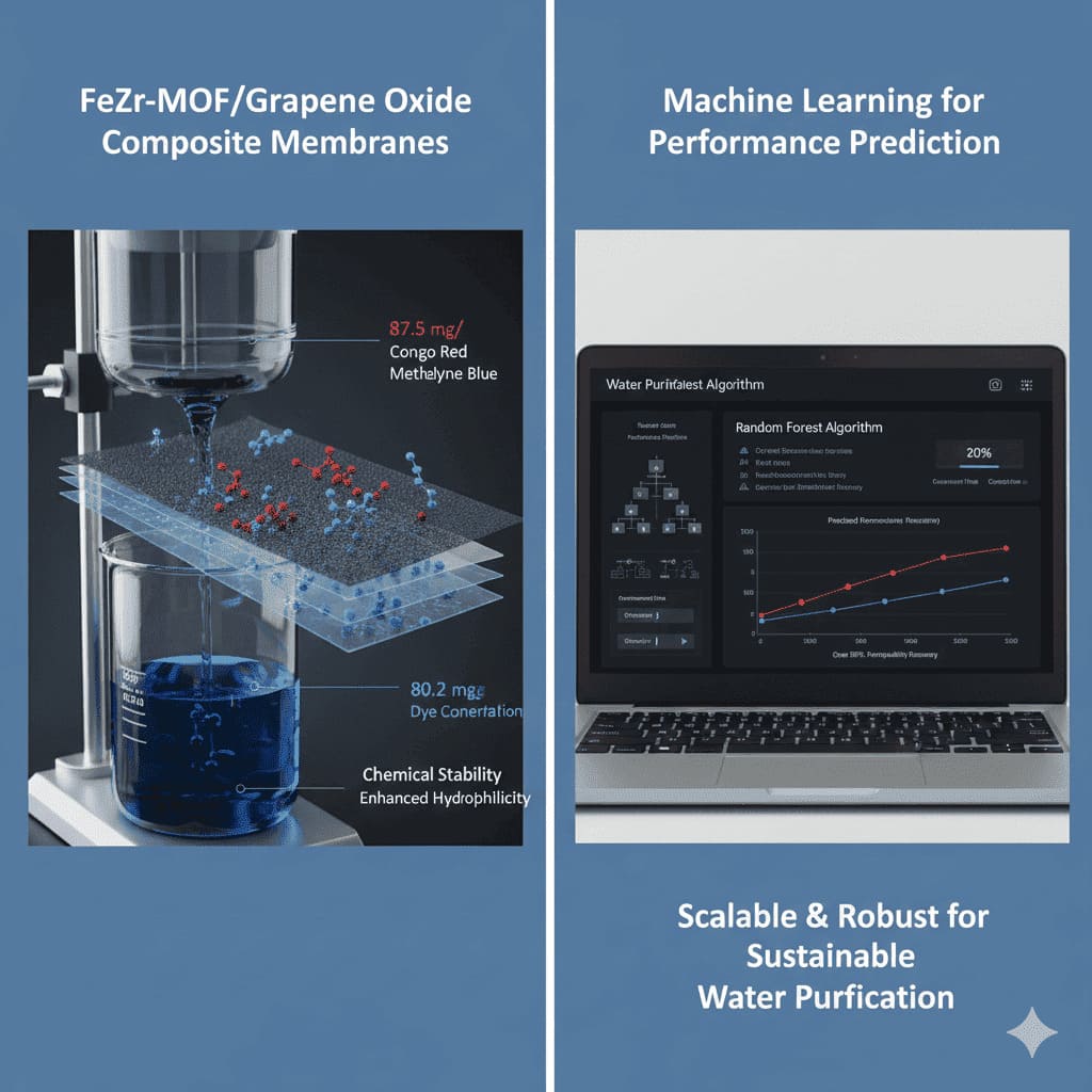Encuentra más información en nuestro repositorio digital Este estudio presenta las membranas compuestas de FeZr-MOF/óxido de grafeno (GO) como una aplicación innovadora de la tecnología de membranas inorgánicas para la separación y purificación avanzadas. Estas membranas fueron diseñadas para eliminar de manera eficiente colorantes industriales como el rojo Congo y el azul de metileno de soluciones acuosas aprovechando la gran área de superficie, la estabilidad química y las capacidades de adsorción selectiva de FeZr-Metal-Organic Framework (FeZr-MOF). Según evaluaciones de laboratorio, las membranas compuestas mostraron un excelente rendimiento de adsorción, alcanzando capacidades de 87,5 mg/g para rojo Congo y 80,2 mg/g para azul de metileno. La integración de GO en la matriz de la membrana mejoró la hidrofilicidad, la permeabilidad al agua y el comportamiento antiincrustante, como lo demuestra una recuperación de la permeabilidad superior al 90 % tras múltiples ciclos de limpieza. Esta investigación refleja los últimos avances en tecnología de membranas inorgánicas y la innovación en materiales que conectan con las necesidades de purificación de agua industrial. Se utilizó el aprendizaje automático (ML), implementado a través del algoritmo Random Forest (RF), para predecir el impacto de los parámetros operativos clave (pH, concentración de tinte y tiempo de contacto) en el rendimiento de eliminación, y las predicciones del modelo se alinearon estrechamente con las tendencias experimentales. Estos hallazgos, respaldados por datos experimentales y modelos predictivos, resaltan el potencial de las membranas FeZr-MOF/GO como un material escalable y robusto para aplicaciones de purificación de agua sustentable. Accede al artículo completo aquí