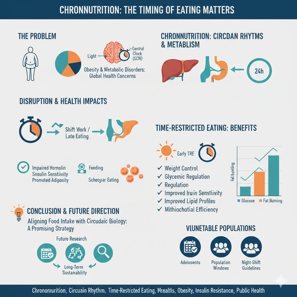 https://url-shortener.me/83Y5 Obesity and metabolic disorders remain major global health concerns, traditionally attributed to excessive caloric intake and poor diet quality. Recent studies emphasize that the timing of meals plays a crucial role in determining metabolic health. This review explores chrononutrition, a growing field that examines how food intake patterns interact with endogenous circadian rhythms to influence energy balance, glucose and lipid metabolism, and cardiometabolic risk. The circadian system, which includes a central clock in the suprachiasmatic nucleus and peripheral clocks in metabolic tissues, regulates physiological functions on a 24 h cycle. While light entrains the central clock, feeding schedules act as key synchronizers for peripheral clocks. Disrupting this alignment—common in modern lifestyles involving shift work or late-night eating—can impair hormonal rhythms, reduce insulin sensitivity, and promote adiposity. Evidence from clinical and preclinical studies suggests that early time-restricted eating, where food intake is confined to the morning or early afternoon, offers significant benefits for weight control, glycemic regulation, lipid profiles, and mitochondrial efficiency, even in the absence of caloric restriction. These effects are particularly relevant for populations vulnerable to circadian disruption, such as adolescents, older adults, and night-shift workers. In conclusion, aligning food intake with circadian biology represents a promising, low-cost, and modifiable strategy to improve metabolic outcomes. Integrating chrononutrition into clinical and public health strategies may enhance dietary adherence and treatment efficacy. Future large-scale studies are needed to define optimal eating windows, assess long-term sustainability, and establish population-specific chrononutritional guidelines. https://doi.org/10.3390/nu17132135