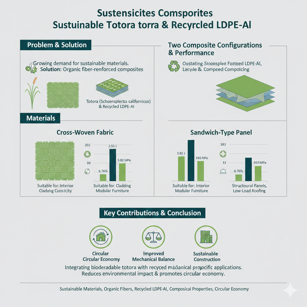 https://url-shortener.me/83YT The growing demand for sustainable materials has driven significant interest in composites reinforced with organic fibers, due to their mechanical performance, availability, and reduced environmental impact. This study investigates the mechanical behavior of two composite configurations: a cross-woven fabric and a sandwich-type panel, both made from totora (Schoenoplectus californicus) and low-density polyethylene–aluminum (LDPE–Al). Our experimental results show that the cross-woven variant achieved higher impact resistance (2.51 J), tensile strength (5.82 MPa), and greater deformation capacity (6.76%), making it more suitable for applications requiring energy absorption and flexibility, such as interior cladding and modular furniture. In contrast, the sandwich configuration exhibited superior stiffness (910 MPa), favoring structural panels and low-load roofing uses. This research distinguishes itself by integrating biodegradable totora fibers with recycled LDPE–Al to fabricate sustainable construction components, advancing circular economy principles while addressing limitations in previous composite formulations through improved mechanical balance and application-specific performance. https://doi.org/10.3390/buildings15132212