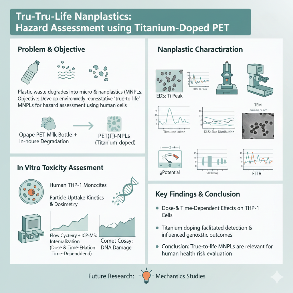 https://url-shortener.me/83XL In the environment, plastic waste degrades into small particles known as microplastics and nanoplastics (MNPLs), depending on their size. Given the potential harmful effects associated with MNPL exposure, it is crucial to develop environmentally representative particles for hazard assessment. These so-called true-to-life MNPLs are generated through in-house degradation of real-world plastic products. In this study, we produced titanium-doped nanoplastics (NPLs) from opaque polyethylene terephthalate (PET) milk bottles, which contain titanium dioxide as a filler. The resulting PET(Ti)-NPLs were thoroughly characterized using scanning electron microscopy (SEM), energy-dispersive X-ray spectroscopy (EDS), mass spectrometry (MS), dynamic light scattering (DLS), ζ-potential measurements, transmission electron microscopy (TEM), and Fourier-transform infrared (FTIR) spectroscopy. Human-derived THP-1 monocytes were employed to investigate particle uptake kinetics, dosimetry, and genotoxicity. A combination of flow cytometry and inductively coupled plasma mass spectrometry (ICP-MS) enabled the quantification of internalized particles, while the comet assay assessed DNA damage. The results revealed dose- and time-dependent effects of PET(Ti)-NPLs on THP-1 cells, particularly in terms of internalization. Titanium doping facilitated detection and influenced genotoxic outcomes. This study demonstrates the relevance of using environmentally representative nanoplastic models for evaluating human health risks and underscores the importance of further mechanistic research. https://doi.org/10.3390/nano15131040