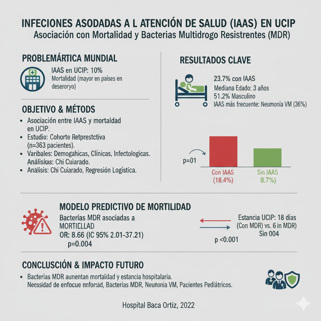 https://url-shortener.me/83WL Las infecciones asociadas a la atención de salud (IAAS) en cuidados intensivos pediátricos (UCIP) resultan en una problemática mundial. La mortalidad derivada de IAAS es de 10% pudiendo ser más alta en países en vías de desarrollo. Objetivo: Determinar la asociación entre IAAS y mortalidad en pacientes pediátricos ingresados en Terapia Intensiva de un hospital de tercer nivel. Pacientes y Método: Estudio observacional de cohorte retrospectiva. Se analizaron variables demográficas, clínicas (diagnóstico, área de procedencia, días de estancia, mortalidad) e infectológicas (tipo de microorganismo, tipo de IAAS, multidrogo resistencia). Mediante prueba Chi cuadrado se evaluó la relación entre mortalidad y desarrollo de IAAS. A través de un modelo de regresión logística se evaluaron otras variables explicativas de la mortalidad. Resultados: Se estudiaron 363 pacientes, de los cuales el 23,7% fue diagnosticado con IAAS. La mediana de edad fue 3 años (RIC: 1-9). El 51,2% correspondieron al sexo masculino. La IAAS más frecuente fue la neumonía asociada a ventilación mecánica (36%). La mortalidad global fue del 10,7 % con diferencia significativa entre los grupos con y sin IAAS (18,4%, vs. 8,7% p:0,01). El modelo predictivo de mortalidad concluyó asociación entre mortalidad y bacterias multidrogo resistentes (MDR) (OR:8,66 IC 95% 2,01-37,21 p= 0,004). Este grupo presentó más días de hospitalización en UCIP (18 vs. 6 días), p = <0,001. Conclusiones: Para los pacientes ingresados en UCIP del Hospital Baca Ortiz durante el año 2022, la presencia de bacterias MDR se asoció con incrementos de mortalidad y estancia hospitalaria. https://doi.org/10.32641/andespediatr.v96i4.5107