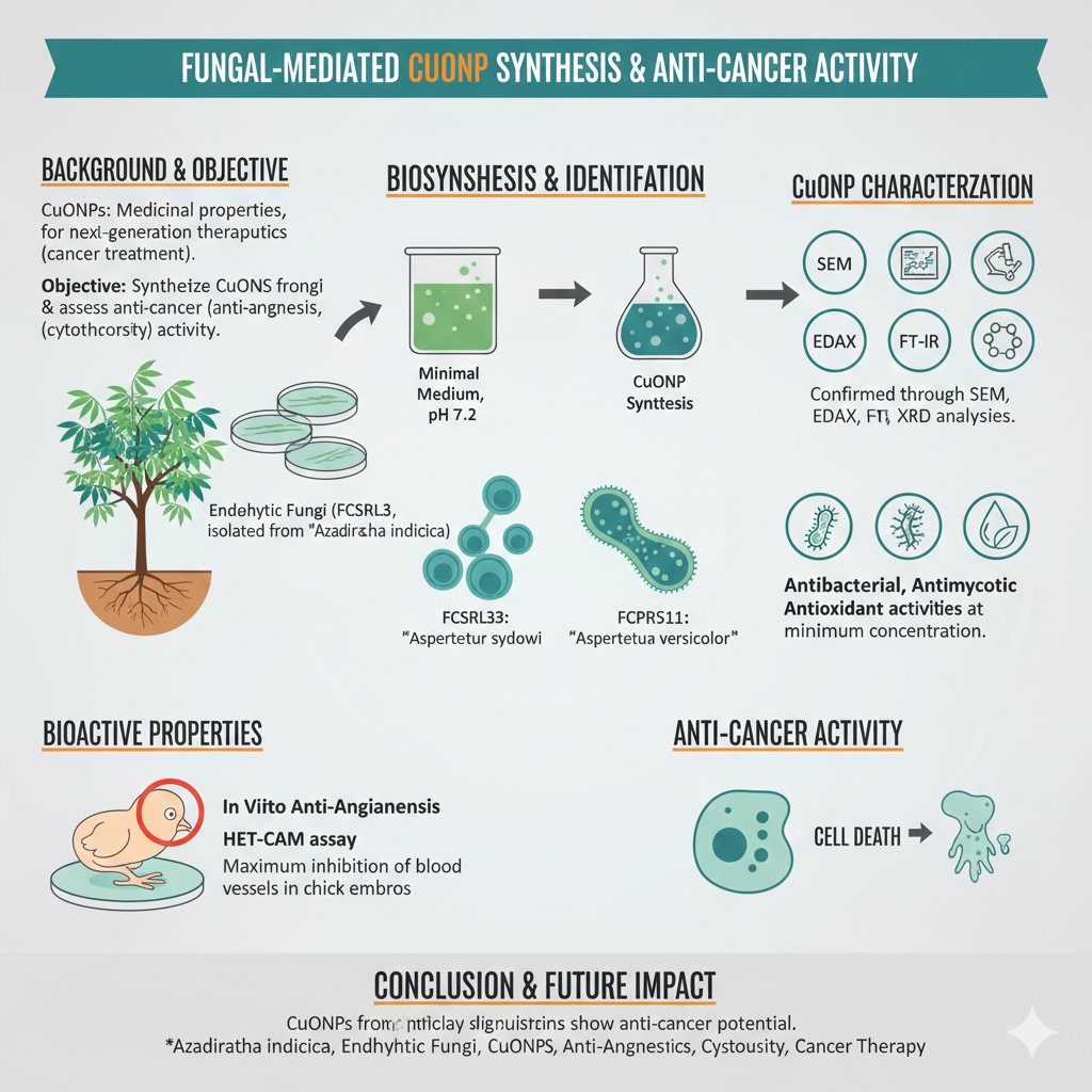 https://url-shortener.me/83V4 Copper Oxide Nanoparticles (CuONPs) contain medicinal properties and are an essential component of the next generation due to their unique properties. CuONPs have a vital role in therapeutics, especially for cancer treatment. This study’s main focus was synthesizing the CuONPs and assessing the anti-cancer activity, including the in vitro anti-angiogenesis and cytotoxicity analyses. CuONPs are synthesized using the enzymatic suspension of endophytic fungal strains FCSRL3 and FCPRS11 isolated from the Azadirachta indica grown in a minimal medium at optimum pH 7.2. About 14 different endophytic fungi confined from the neem tree, and the antagonistic and antioxidant properties were evaluated. The efficient FCSRL3 and FCPRS11 were identified as Aspergillus sydowi and Aspergillus versicolor at a molecular level. The synthesized CuONPs from two fungi were confirmed through characterization determination using SEM, EDAX, FT-IR, and XRD analyses. CuONPs revealed maximum antibacterial, antimycotic, and antioxidant activities at minimum concentration, exerting the highest bioactive properties. The anti-angiogenic activity of the CuONPs from two different fungal strains exhibited maximum inhibition of blood vessels in chick embryos, and the assessment was performed using HET-CAM. The outcomes of this research demonstrate the notable role of CuONPs in cancer remedies.https://doi.org/10.1016/j.bioorg.2025.108679