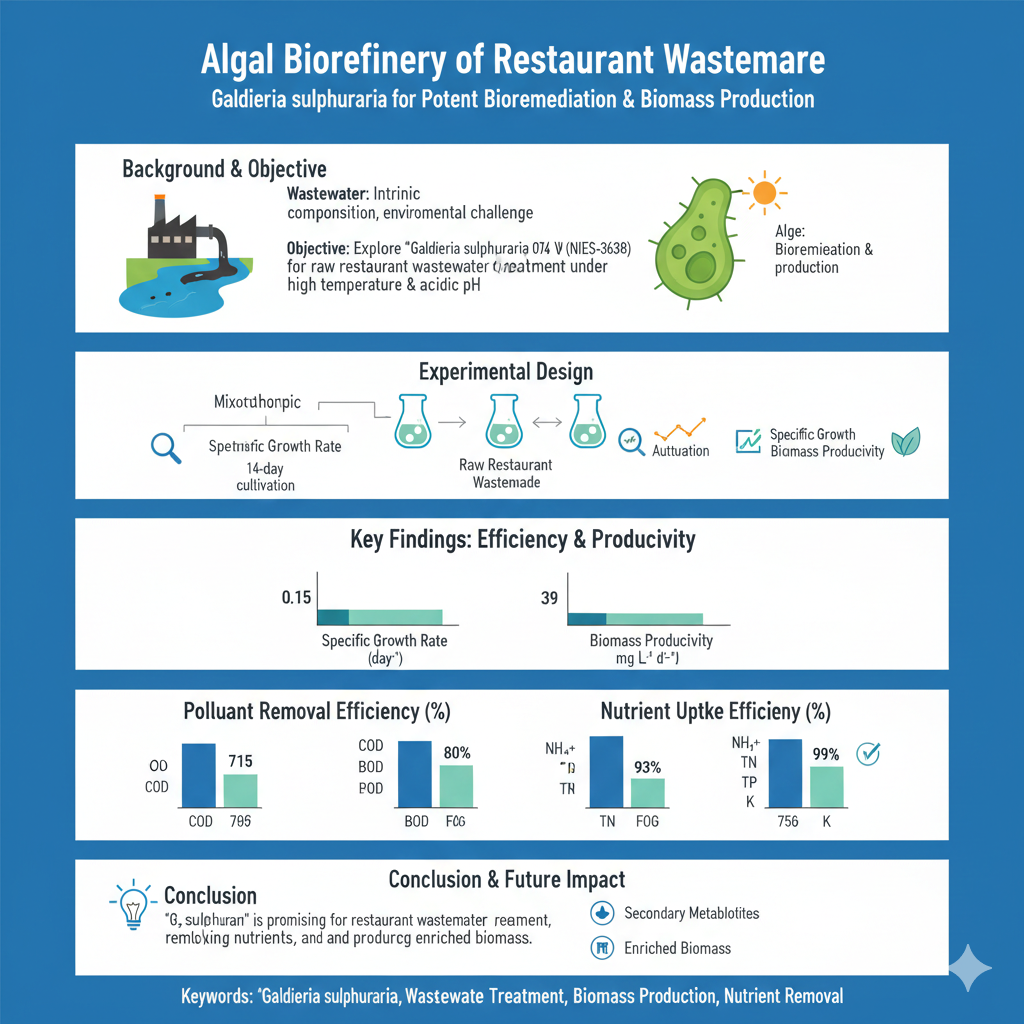https://url-shortener.me/83VV Recently, some applied sciences have focused on the biorefinery of wastewater because of its intrinsic composition. Algal-based wastewater treatment was explored for its potent bioremediation ability and biomass production, which can be used in various applications. When considering microalgae cultivation’s role in integrated production systems, especially when using wastewater and gaseous effluents, the hunt for new potential strains is crucial. This research explored the potential of microalga Galdieria sulphuraria (G. sulphuraria) 074 W (NIES-3638) to bioremediate raw restaurant wastewater owing to its distinct characteristics, including high temperature and acidic pH settings. The cultivation conditions were subjected to three cultivation modes (i.e., mixotrophic, heterotrophic, and autotrophic) for 14 days. During the cultivation of G. sulphuraria, various evaluations, including optical density, specific growth rate, and biomass productivity, were examined. Furthermore, the bioremediation efficiency of G. sulphuraria was examined for the removal of pollutants, including chemical oxygen demand (COD), biochemical oxygen demand (BOD), fats, oil, grease (FOG), and uptake of nutrient such as ammoniacal-nitrogen (NH4+-N), total-nitrogen (TN), total-phosphorus (TP), and potassium (K). G. sulphuraria grown with restaurant wastewater scored 0.15 day−1 for specific growth rate and 39 mg L-1 d-1 biomass productivity. The maximum removal efficiencies for COD, BOD, FOG, NH4+-N, TN, TP, and K were 71%, 80%, 66%, 96%, 93%, 99%, and 75%, respectively. Overall, this study revealed that using G. sulphuraria is a promising approach for treating restaurant wastewater by removing pollutants, uptaking nutrients, and producing enriched biomass that can be further utilized to generate secondary metabolites. https://doi.org/10.1016/j.jestch.2025.102091