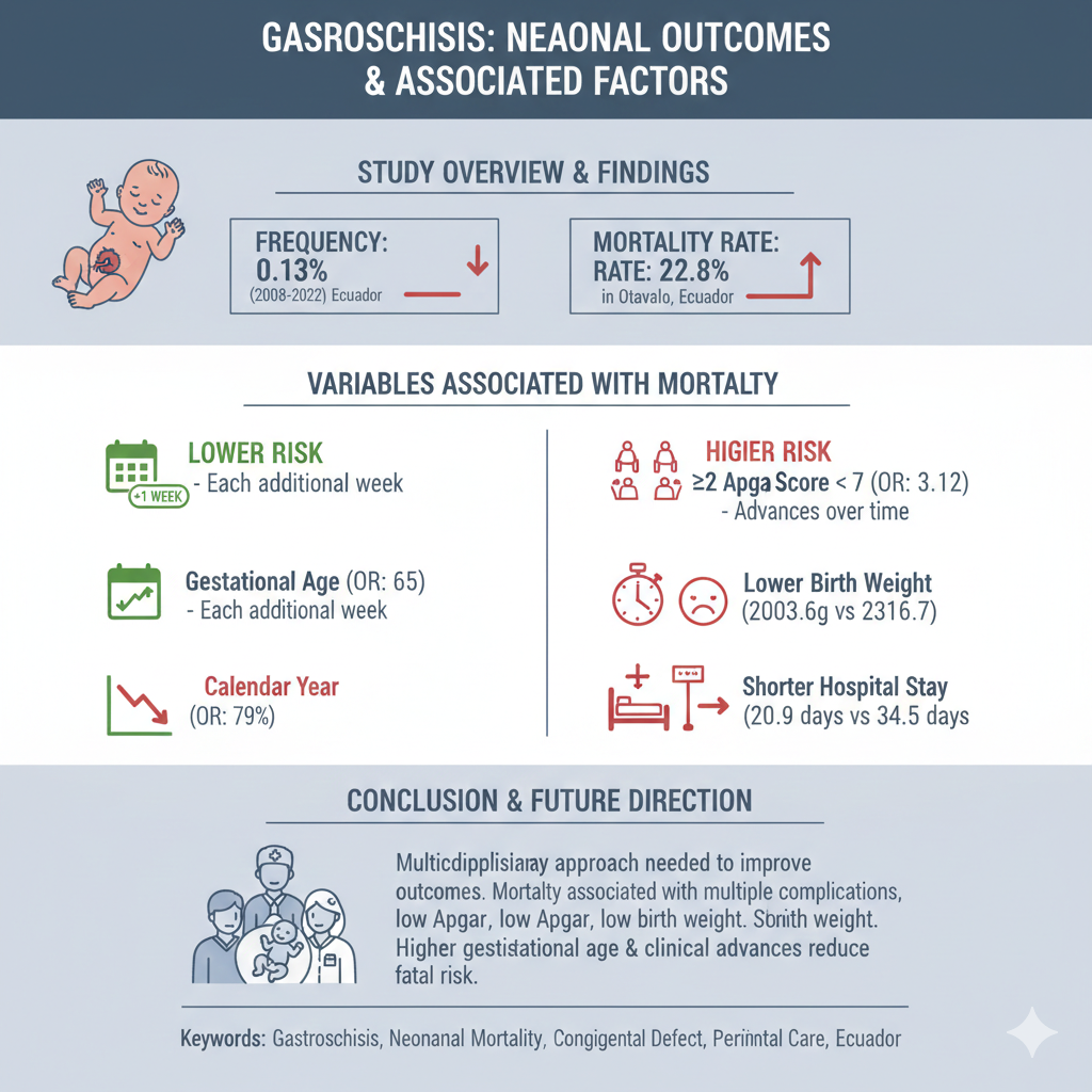 https://url-shortener.me/83WC Gastroschisis is a congenital defect characterized by the protrusion of abdominal viscera through a paraumbilical opening. Objective: To determine the frequency of gastroschisis and describe variables associated with neonatal mortality. Patients and Method: A cross-sectional study based on data from the Perinatal Information System of the Hospital Gineco Obstétrico Isidro Ayora (2008–2022). Socio-demographic, obstetric, and neonatal variables were analyzed using Bayesian tests for contingency ta-bles, logistic regression, and the Bayesian t-test analog. Results: A total of 175 neonates were included (58.9% female). The frequency of gastroschisis was 0.13% (95% CI: 0.11–0.15), with a mortality rate of 22.8%. There was a negative association with gestational age (OR: 0.65; 95% CI: 0.49–0.85) and calendar year (OR: 0.79; 95% CI: 0.68–0.91), indicating lower mortality with each additional week of gestation and over time. The presence of ≥2 complications (OR: 3.46; 95% CI: 1.30–7.12) and Apgar score < 7 at five minutes (OR: 3.12; 95% CI: 1.01–60.91) were positively associated with mortality. Deceased neonates had lower birth weight (2,003.6g versus 2,316.7g; BF10=35.2) and shorter hospital stay (20.9 days versus 34.5 days; BF10=204). Conclusions: Gastroschisis showed a high frequency, with mortality associated with multiple complications, low Apgar scores, and low birth weight, while higher gestational age and advances in clinical management over the years were associated with a lower fatal risk. The need for a multidisciplinary approach to improve neonatal outcomes in this population is emphasized. © 2025, Sociedad Chilena de Pediatria. All rights reserved. https://doi.org/10.32641/andespediatr.v96i4.5517