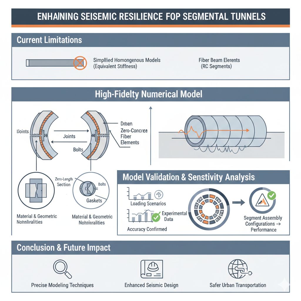 https://url-shortener.me/83VK Ensuring the seismic resilience of segmental tunnels is essential for safeguarding urban transportation systems, especially in earthquake-prone areas where structural integrity is critical. Conventional seismic analysis methods typically rely on simplified models, utilizing homogeneous beam or shell elements with equivalent stiffness properties to approximate tunnel behavior under seismic loading. To overcome these limitations, this study presents an advanced, high-fidelity numerical model tailored for segmental tunnels, incorporating material and geometric nonlinearities while maintaining computational efficiency. The proposed model uses fiber beam elements to precisely represent the reinforced concrete segments. In contrast, zero-length section elements simulate the intricate interactions between tunnel joints, bolts, gaskets, and concrete surfaces. The model’s accuracy is rigorously validated through experimental data from three distinct loading scenarios, confirming its capability to reliably predict the seismic response of segmental tunnels. Beyond experimental validation, a comprehensive sensitivity analysis is performed to examine the influence of different segment assembly configurations on the seismic behavior of tunnels. The findings indicate that the arrangement and mechanical properties of the segments significantly affect the overall structural performance, highlighting the necessity of precise modeling techniques. The proposed model is a valuable tool for enhancing the seismic design of underground transportation networks by offering a more detailed and accurate representation of segmental tunnel behavior. https://doi.org/10.1016/j.istruc.2025.109164