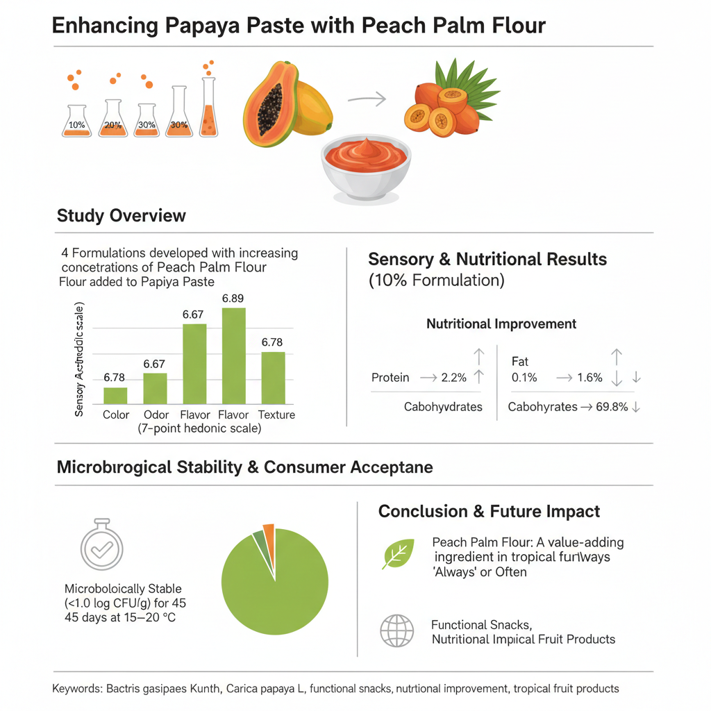 https://rebrand.ly/ytmsp80 The incorporation of functional ingredients into processed foods represents a promising strategy to enhance their nutritional and sensory profiles. This study evaluated the effect of adding peach palm (Bactris gasipaes Kunth) flour on the physicochemical, functional, microbiological, and sensory characteristics of a papaya (Carica papaya L.) paste. Four formulations were developed with increasing concentrations of peach palm flour (10, 20, 30, and 40% w/w). The 10% formulation showed the highest sensory acceptance, with mean scores of 6.78 for color, 6.67 for odor, 6.89 for flavor, and 6.78 for texture (7-point hedonic scale). This formulation also showed a significant increase in protein content (from 0.3% to 2.2%) and fat content (from 0.1% to 1.6%), along with a reduction in carbohydrate content (from 72.6% to 69.8%), compared to the control, without compromising sensory perception. The product remained microbiologically stable (<1.0 log CFU/g for aerobic mesophilic bacteria and molds/yeasts) for 45 days at 15–20 °C. A total of 87% of consumers reported that they would consume the product “always” or “often”, confirming its acceptability. These findings support the use of peach palm flour as a value-adding ingredient in tropical fruit-based functional products.Keywords: Bactris gasipaes Kunth; Carica papaya L.; functional snacks; nutritional improvement; tropical fruit products. https://doi.org/10.31413/nat.v13i3.19462