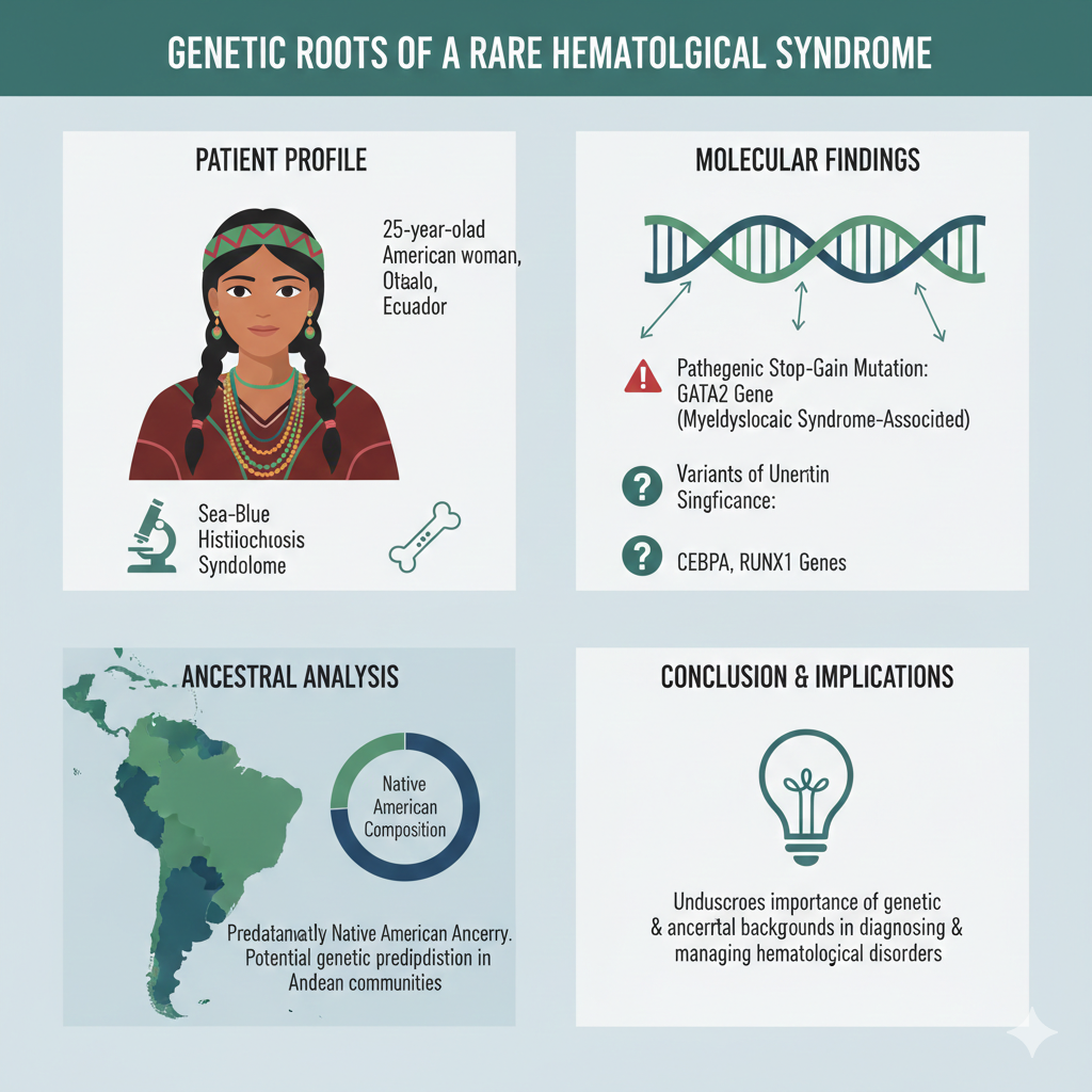 https://rebrand.ly/hlhfiro This study presents a case of a 25-year-old Native American woman from Otavalo, Ecuador, diagnosed with sea-blue histiocytosis and myelodysplastic syndrome. Bone marrow aspiration revealed sea-blue histiocytes, and next-generation sequencing identified a likely pathogenic stop-gain mutation in the gene, associated with myelodysplastic syndrome. Additionally, variants of uncertain significance were found in the and genes. Ancestral analysis showed a predominantly Native American composition, suggesting a potential genetic predisposition specific to Andean communities. The report underscores the importance of understanding genetic and ancestral backgrounds in diagnosing and managing hematological disorders. http://doi.org/10.5867/medwave.2025.07.3051