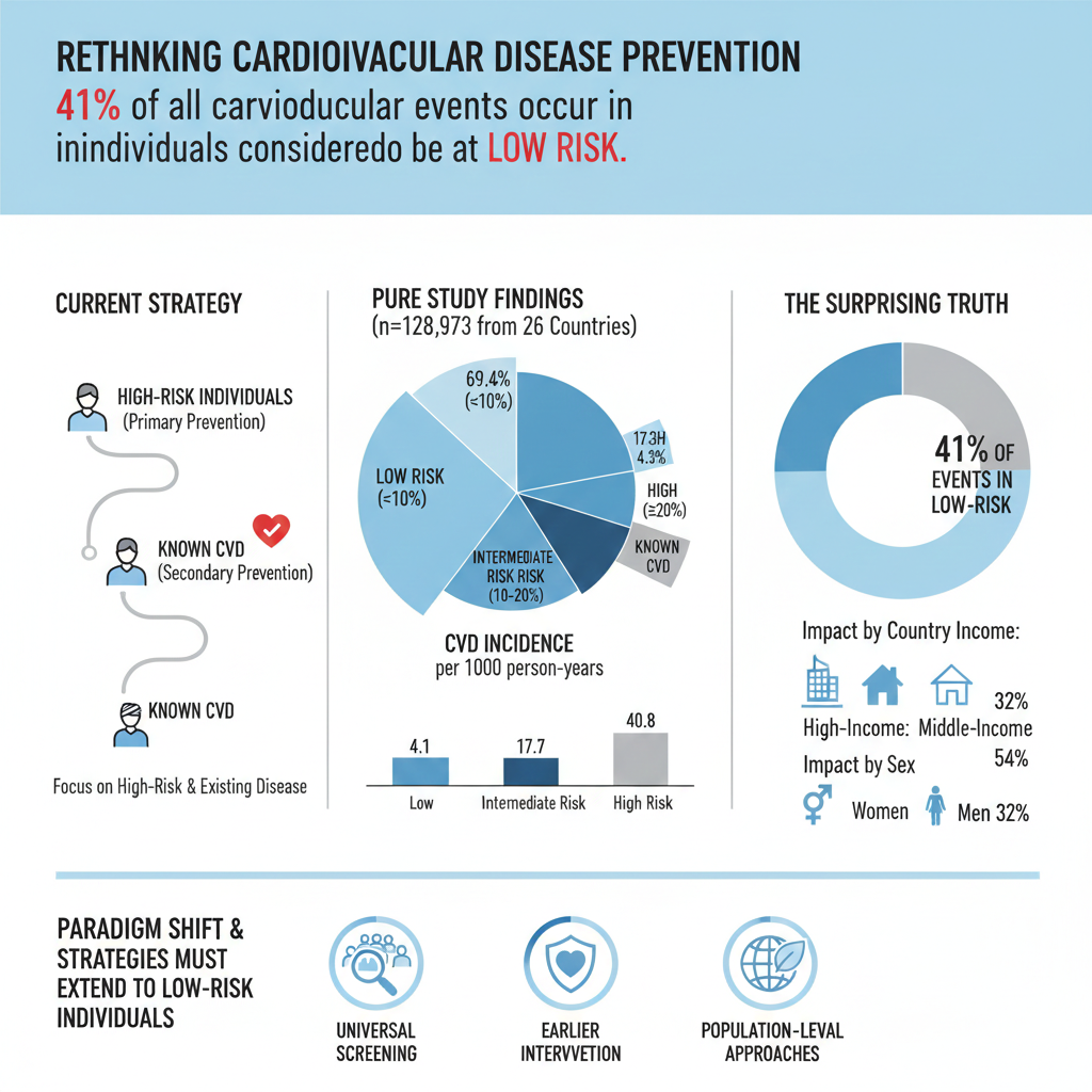 https://url-shortener.me/83U6 Background: Current strategies to prevent adverse cardiovascular outcomes focus primary prevention in high-risk groups and secondary prevention in people with known cardiovascular disease. We aimed to determine the proportion of events occurring in lower-risk groups globally. Methods: We included people aged 40 years to younger than 75 years who were enrolled in the Prospective Urban Rural Epidemiology (PURE) study, which is an ongoing, international, prospective, population-based cohort study that started recruiting adults from households selected to be broadly representative of the sociodemographic composition of their communities. We prospectively documented fatal or non-fatal myocardial infarction, stroke, heart failure, or any other fatal cardiovascular event stratified by history of cardiovascular disease and by the 10-year predicted disease risk scores based on WHO 2019 laboratory risk tables (<10% [low], 10% to <20% [intermediate], and ≥20% [high]) in people without previous cardiovascular disease from 26 high-income, middle-income, and low-income countries. Outcome event rates were standardised for the cohort’s age and sex distribution. Findings: Between July 11, 2000, and May 6, 2019, 128 973 participants were included from 26 countries (mean age 53·6 years [SD 8·2]; 75 858 [58·8%] were female and 53 115 [41·2%] were male). We observed 11 483 outcome events affecting 8·9% of the cohort during a median follow-up of 12·3 years (IQR 9·8–14·6). Among participants, 89 508 (69·4%) had a low cardiovascular disease risk, 22 363 (17·3%) had an intermediate cardiovascular disease risk, and 5529 (4·3%) had a high cardiovascular disease risk, while 11 573 (9·0%) had known cardiovascular disease. The age-standardised and sex-standardised cardiovascular disease incidence rates per 1000 person-years was 4·1 (95% CI 4·0–4·2) in the low-risk group, 17·7 (15·2–20·2) in the intermediate-risk group, and 40·8 (25·1–56·4) in the high-risk group. Overall, 41% of outcome events occurred in cardiovascular disease-naive participants at low risk. The proportion of adverse cardiovascular outcomes occurring in this low-risk group was inversely related to country income level (32% in high-income, 38% in middle-income, and 54% in low-income countries) and was higher in women (51%) than in men (32%). Interpretation: To achieve a substantial population-level reduction in cardiovascular disease, a fundamental change is needed, so that preventive strategies for cardiovascular disease extend beyond those at high or even intermediate predicted risk to include those at considered to be at low risk. Funding: The funding bodies are listed in the appendix (p 29). https://doi.org/10.1016/S2214-109X(25)00155-X