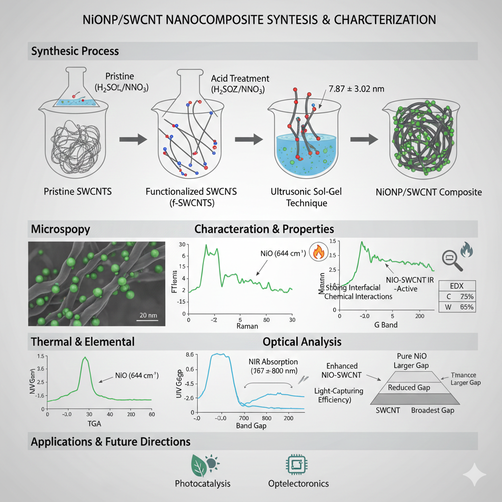 https://rebrand.ly/zlts97d The decoration of carbon nanotubes with metal oxide nanoparticles has been employed to enhance their intrinsic properties and expand their applicability across various technological fields. This study investigated the functionalization of single-walled carbon nanotubes (SWCNTs) by treating them with a 3:2 mixture of sulfuric acid and nitric acid, which introduces oxygen-containing functional groups to enhance their dispersibility and reactivity. Nickel oxide nanoparticles (NiONPs) were synthesized and integrated onto the functionalized SWCNTs using an ultrasonic-assisted sol-gel technique, allowing uniform distribution. Then, the NiONP/SWCNT composite was evaluated for thermal stability and elemental composition via thermogravimetric analysis (TGA) and energy-dispersive X-ray spectroscopy. Both field emission scanning electron microscopy and high-resolution transmission electron microscopy confirmed the successful decoration of NiONPs (particle size <20 nm, mean value of 7.87 ± 3.02 nm) on the SWCNTs. Fourier-transform infrared spectroscopy revealed characteristic peaks corresponding to NiO at 644 cm−1 as IR-active modes induced by NiO–SWCNT and Raman spectroscopy further verified the chemical bonding between NiONPs and SWCNTs. This shows shifts in the radial breathing mode and G bands of SWCNTs, indicative of strong interfacial chemical interactions. Optical analysis demonstrated that the NiO-SWCNT nanocomposite exhibited a reduced band gap compared to pure NiO nanoparticles but a broader band gap than intermediate-phase SWCNT configurations. In addition, UV–Vis spectroscopy identified a prominent absorption peak within the 600–800 nm wavelength range, aligning with the near-infrared (NIR) spectral region. This enhanced NIR absorption suggests improved light-capturing efficiency, which could significantly benefit applications in photocatalysis and optoelectronics. https://doi.org/10.1016/j.ceramint.2025.06.181