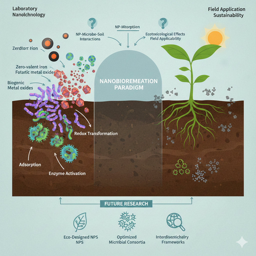 https://rebrand.ly/c8rv1mw Heavy metals (HMs) in soil are a big threat to environmental and agricultural sustainability. This review discusses the development of the nanobioremediation paradigm (an approach combining nanotechnology and microbiological processes) for the treatment of HM toxicity. Recent advances in nanoparticle (NP)-based approaches to their ability to improve microbial detoxification methods, such as adsorption, redox transformation, and enzyme activation forms of microbial detoxification are discussed. Key findings suggest that many engineered NPs (e.g., zero-valent iron, biogenic metal oxides) can enhance HM immobilization efficiencies and contour microbial performances and functions of the soil microbiome. Still, there are areas of uncertainty regarding NP-microbe-soil interactions, long-term ecotoxicological effects, and applicability at the field level that are critical to be discussed. Future research directions are advised to focus on the eco-designed NPs, optimizing microbial consortia specific to the soil, and interdisciplinary frameworks linking the laboratory methods and materials to the real-world applications. https://doi.org/10.1016/j.jenvman.2025.126736