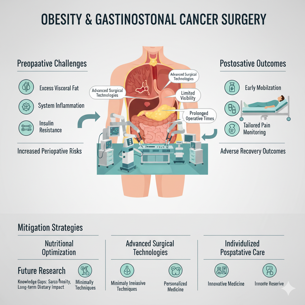 https://rebrand.ly/ou7e9ed Obesity significantly affects gastrointestinal cancer surgery outcomes by creating complex challenges throughout the preoperative, intraoperative, and postoperative stages. This narrative review explores the intricate relationship between obesity and GIC surgery, highlighting the dual burden of obesity as a global public health issue and a determinant of surgical complications. The review aims to analyze physiological and technical hurdles, including limited visibility, prolonged operative times, increased perioperative risks, and adverse recovery outcomes associated with obesity. Evidence emphasizes the critical role of excess visceral fat, systemic inflammation, and insulin resistance in elevating surgical risks. Mitigation strategies involve preoperative nutritional optimization, use of advanced surgical technologies such as robotic-assisted and laparoscopic systems, and individualized postoperative care, encompassing early mobilization, tailored pain management, and close monitoring of metabolic parameters. Despite advancements, knowledge gaps remain, particularly regarding sarcopenic obesity and the long-term impact of preoperative dietary interventions. Future research should focus on refining minimally invasive techniques, integrating personalized medicine, and exploring innovative perioperative protocols to address obesity-related risks effectively. By fostering a multidisciplinary approach, this review underscores the necessity for targeted interventions to enhance outcomes and improve the quality of care for patients with obesity undergoing gastrointestinal cancer surgery. https://doi.org/10.1016/j.semcancer.2025.06.010