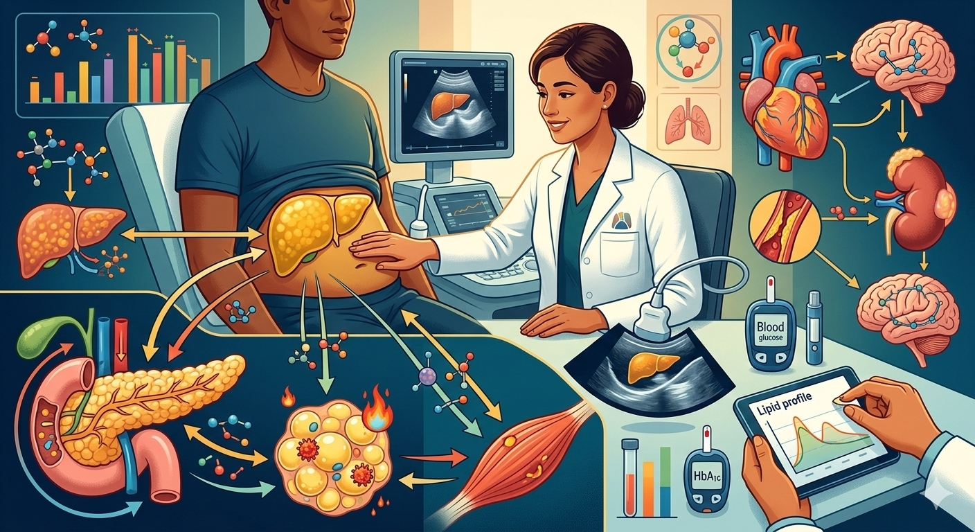 La enfermedad hepática esteatótica asociada a disfunciones metabólicas (MASLD) es un trastorno generalizado que está fuertemente asociado con afecciones metabólicas como obesidad, resistencia a la insulina y diabetes tipo 2 (DT2). La progresión de MASLD, que puede conducir a complicaciones graves como fibrosis hepática y cirrosis, está estrechamente relacionada con los riesgos cardiometabólicos, incluidas las enfermedades cardiovasculares, y con cánceres relacionados con el hígado asociados con disfunciones metabólicas. Los endocrinólogos están en una posición única para detectar MASLD temprano, particularmente en individuos con factores de riesgo metabólicos como T2D, síndrome del ovario poliquístico (SOP) y disfunción tiroidea.