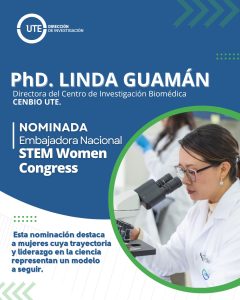 La destacada científica ecuatoriana Linda Guamán, directora del Centro de Investigación Biomédica de la Universidad UTE, ha sido nominada a Embajadora Nacional del STEM Women Congress Ecuador 2025, un evento que celebra el liderazgo y la participación de las mujeres en las áreas de ciencia, tecnología, ingeniería y matemáticas (STEM, por sus siglas en inglés).
