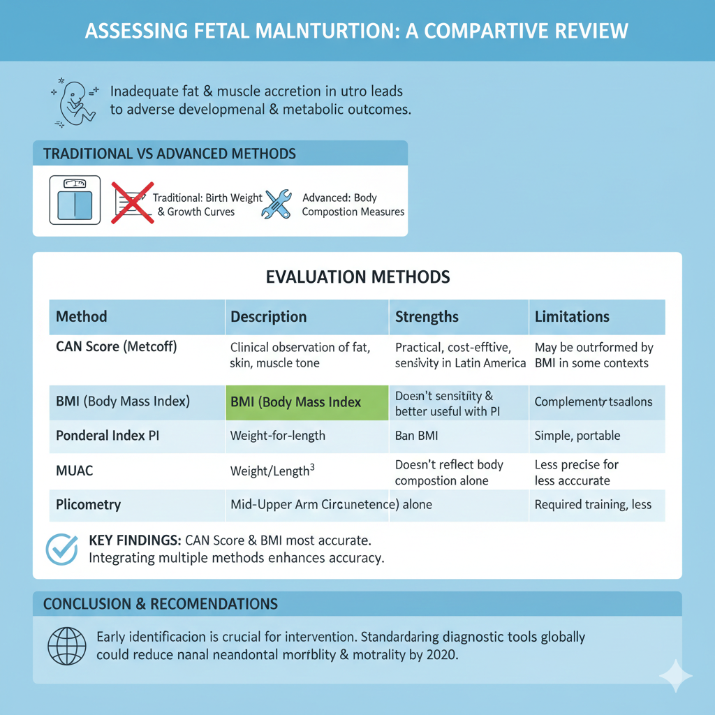 Esta revisión compara varios métodos de evaluación -puntuación CAN (metodología Metcoff), índice de masa corporal (IMC), índice ponderal (IP), índice McLaren, circunferencia media superior del brazo (MUAC) y plicometry- para proporcionar sugerencias sobre la selección del enfoque más apropiado, según el entorno sanitario y las necesidades de la población.
