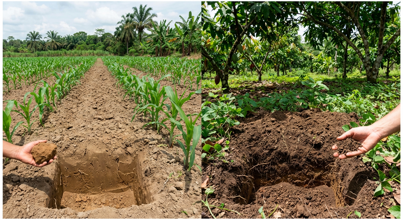Los sistemas de monocultivo degradan el suelo afectando sus propiedades físicas y químicas, y su regeneración es muy lenta. Con el objetivo de conocer cambios en las propiedades físicas del suelo de la Estación Experimental Tropical Pichilingue, por efecto del uso, se empleó un diseño de bloques completos al azar con tres repeticiones, en los suelos de bosque nativo y monocultivos de maíz (30 años), cacao (50 años), pasto (4 años) y palma aceitera (26 años) en diferentes profundidades cada 0,10 m hasta los 0,6 m. Se evaluaron propiedades físicas como conductividad hidráulica, densidad aparente, densidad real, porosidad total, porosidad de aireación, humedad volumétrica, textura, arcilla dispersa en agua, grado de floculación, materia orgánica e índice de materia orgánica/limo+arcilla. Los datos fueron analizados estadísticamente y se realizó la prueba de Tuckey (P≤0,05). Se encontró que maíz, palma aceitera y pasto provocaron incrementos estadísticos significativos en la densidad aparente del suelo sin llegar a sobrepasar los niveles críticos de 1390 kg m-3 y no significativos en reducción de la porosidad total en la profundidad de 0,1-0,2 m. También, hubo alta concentración de arcillas en las primeras profundidades de los suelos cultivados, que provocó susceptibilidad a los procesos de erosión hídrica, concluyendo que el suelo bajo cultivo de palma aceitera mostró mayores diferencias estadísticas debido a la textura, afectando negativamente la densidad aparente del suelo, conductividad hidráulica, arcilla dispersa en agua, que en suma contribuyen a disminuir la estabilidad de agregados.